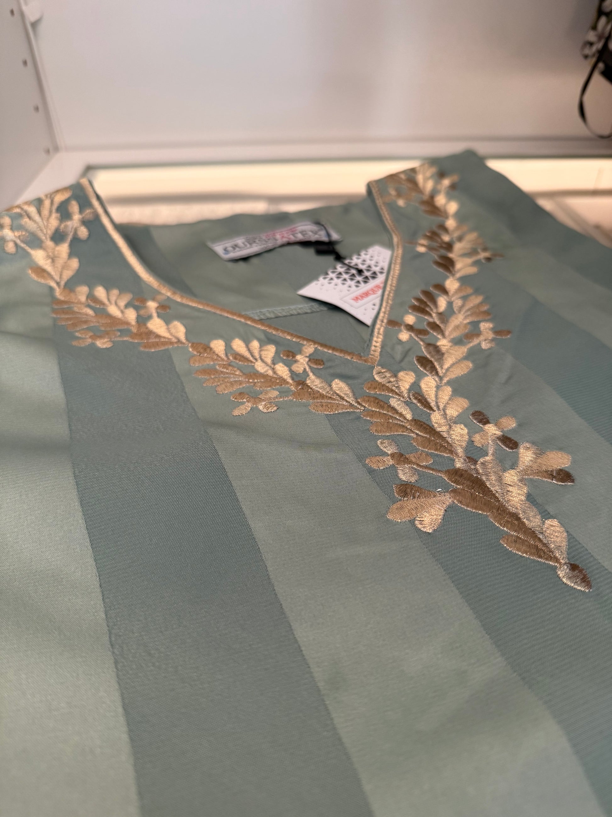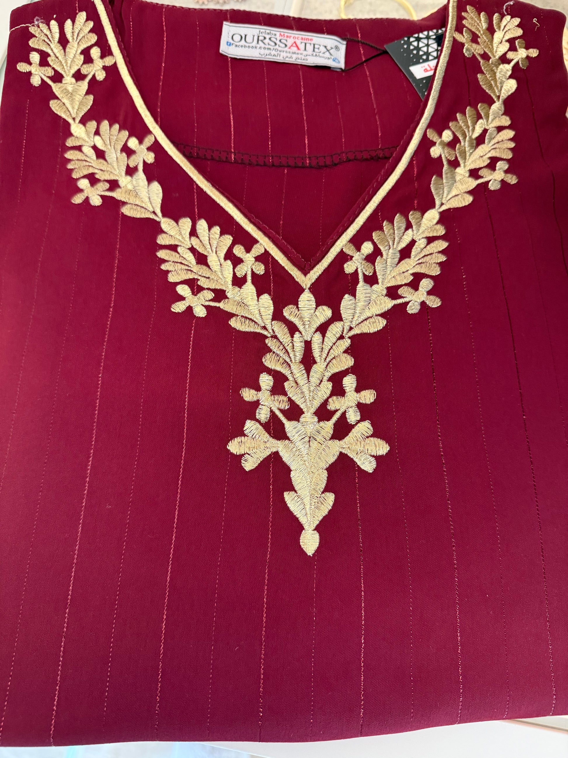 Caftan chic et discret, confectionné dans un tissu fluide à fines rayures subtiles. Son col en V est délicatement rehaussé d’une broderie dorée florale, qui apporte une touche raffinée. Parfait pour une petite occasion ou un événement en famille, il allie élégance et simplicité