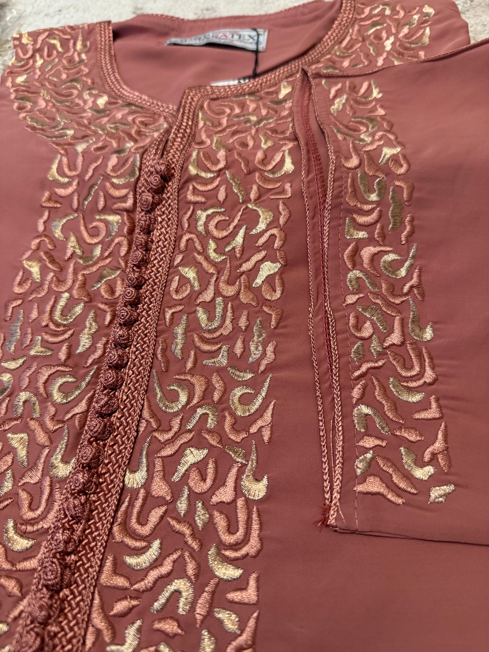 Le caftan Asila est une ode à la féminité estivale. Confectionné dans un crêpe d’une légèreté exceptionnelle, ce modèle fluide épouse délicatement les mouvements du corps, offrant un tombé gracieux et aérien à chaque pas.