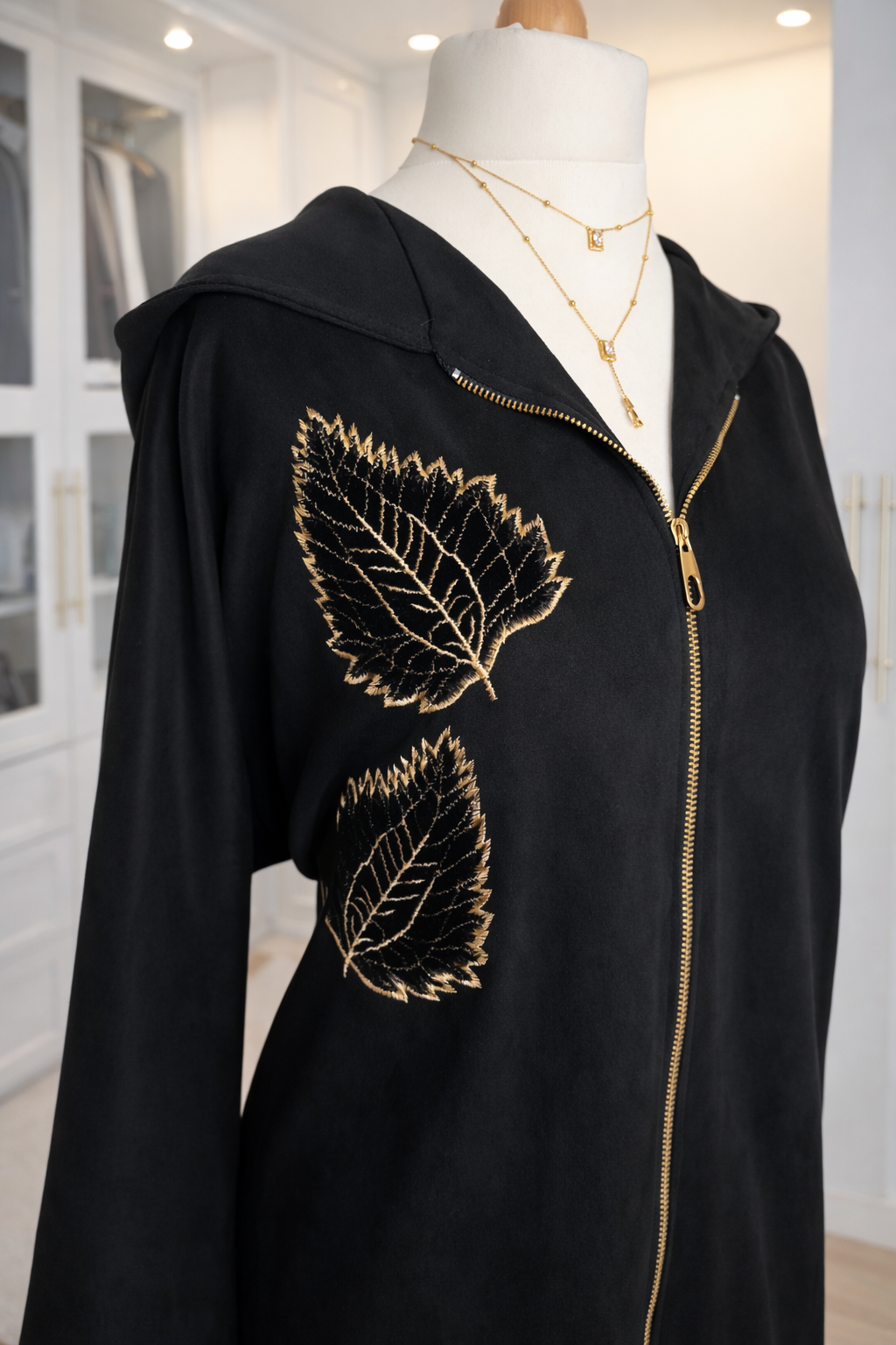 Cette jellaba robe en faux daim allie parfaitement tradition et modernité. Sa coupe élégante conserve l’authenticité de la jellaba, tandis que la tirette dorée apporte une touche contemporaine et raffinée. Les délicates broderies en forme de feuilles subliment le modèle avec finesse.
